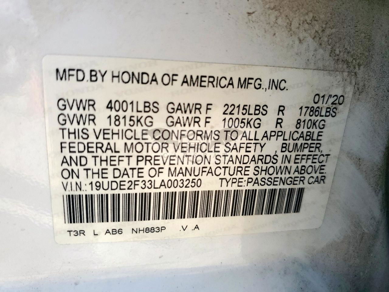 • VIN: 19UDE2F33LA003250