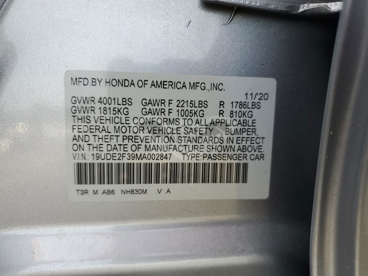 • VIN: 19UDE2F39MA002847