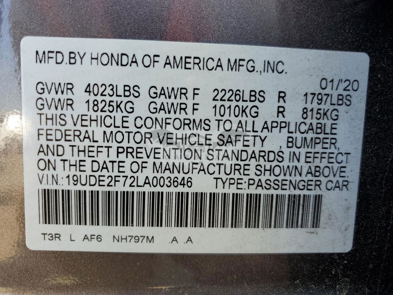 • VIN: 19UDE2F72LA003646