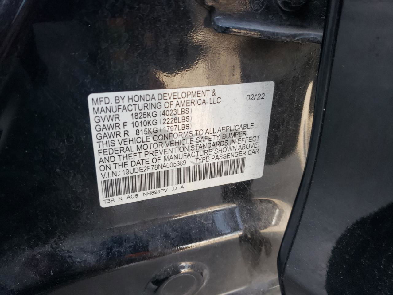• VIN: 19UDE2F78NA005369