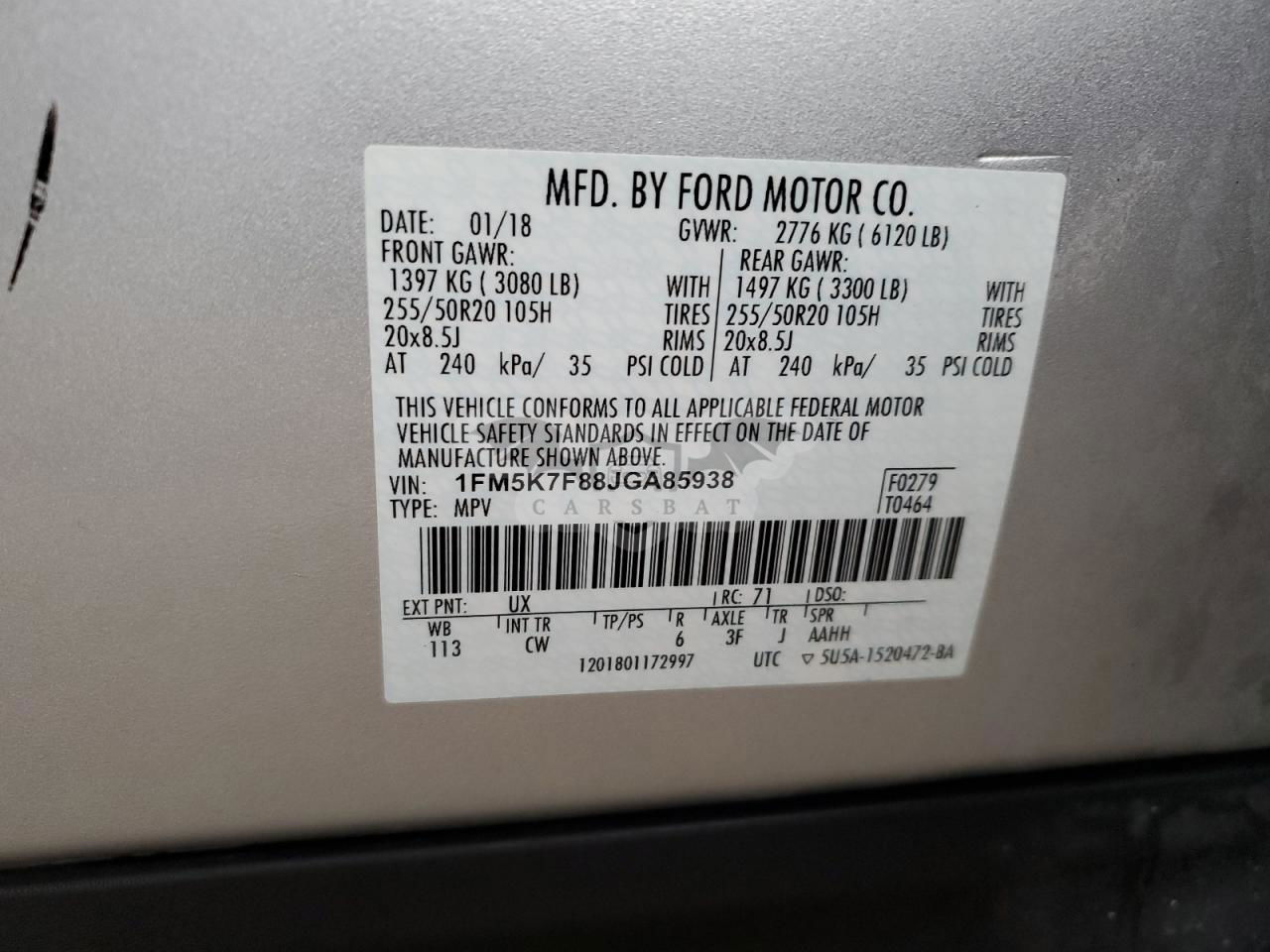 • VIN: 1FM5K7F88JGA85938