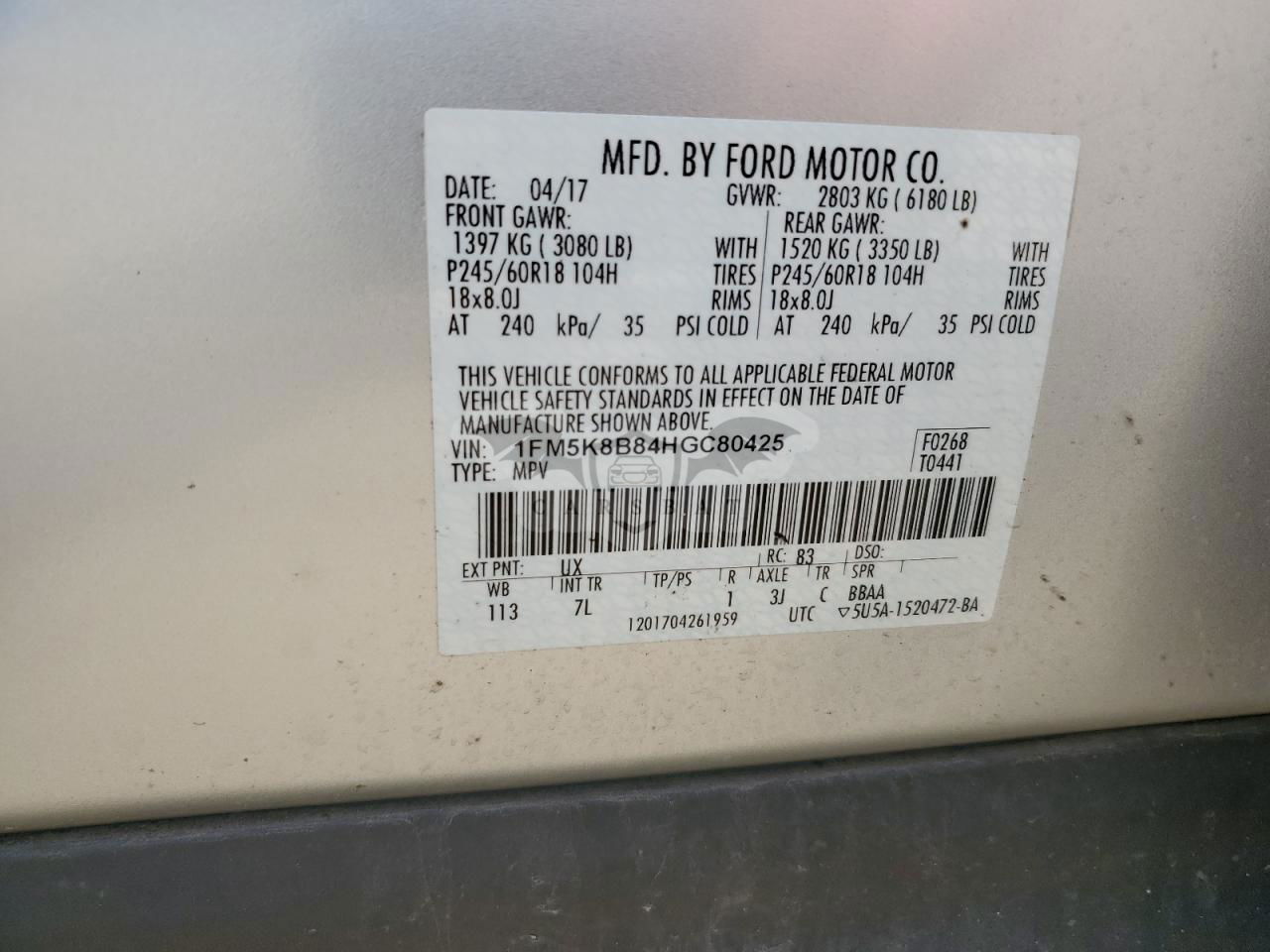 • VIN: 1FM5K8B84HGC80425