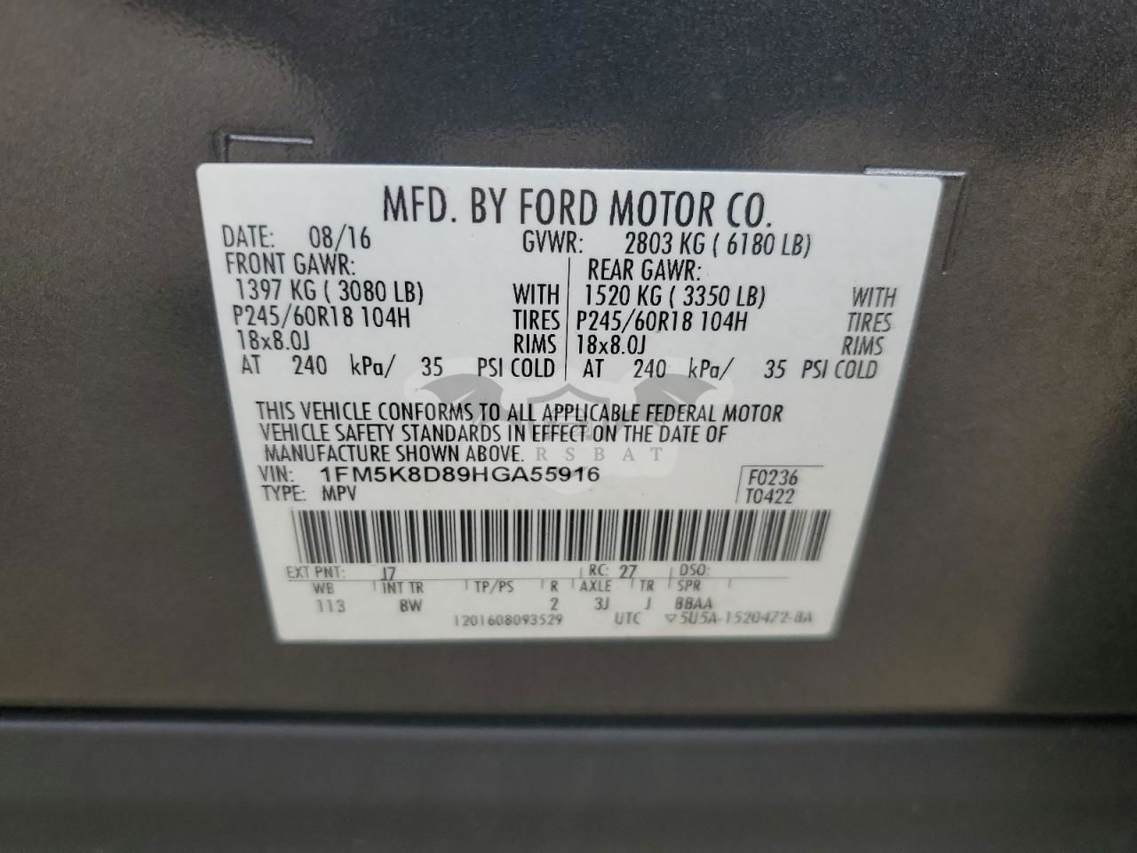 • VIN: 1FM5K8D89HGA55916