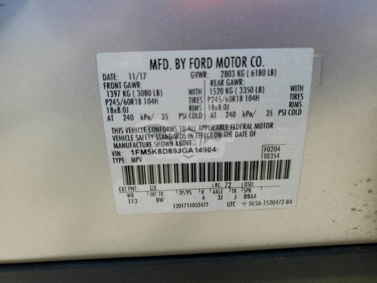 • VIN: 1FM5K8D89JGA14904