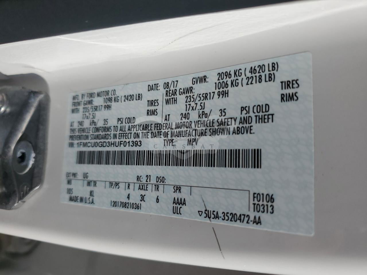 • VIN: 1FMCU0GD3HUF01393