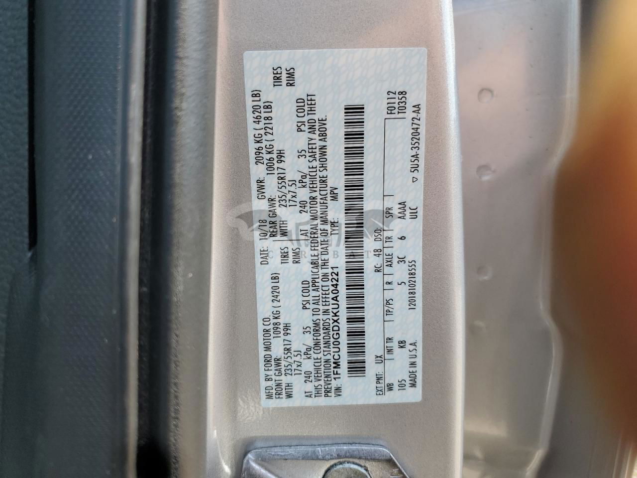 • VIN: 1FMCU0GDXKUA04221