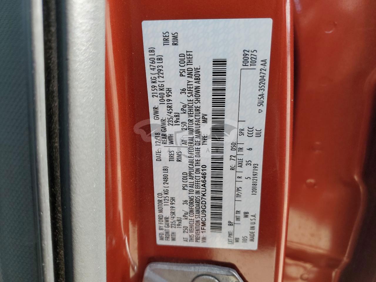• VIN: 1FMCU9GD7KUA64610