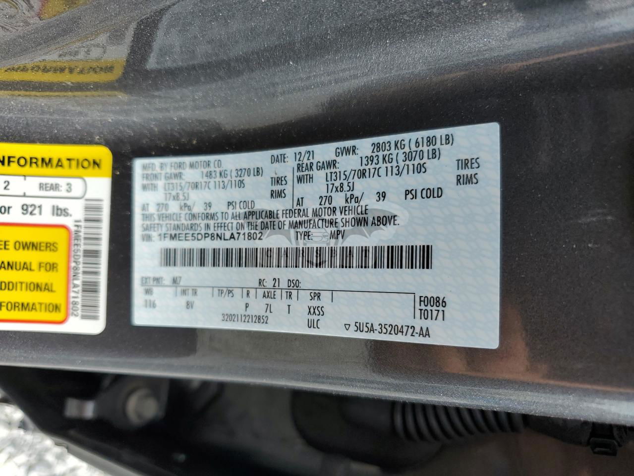 • VIN: 1FMEE5DP8NLA71802