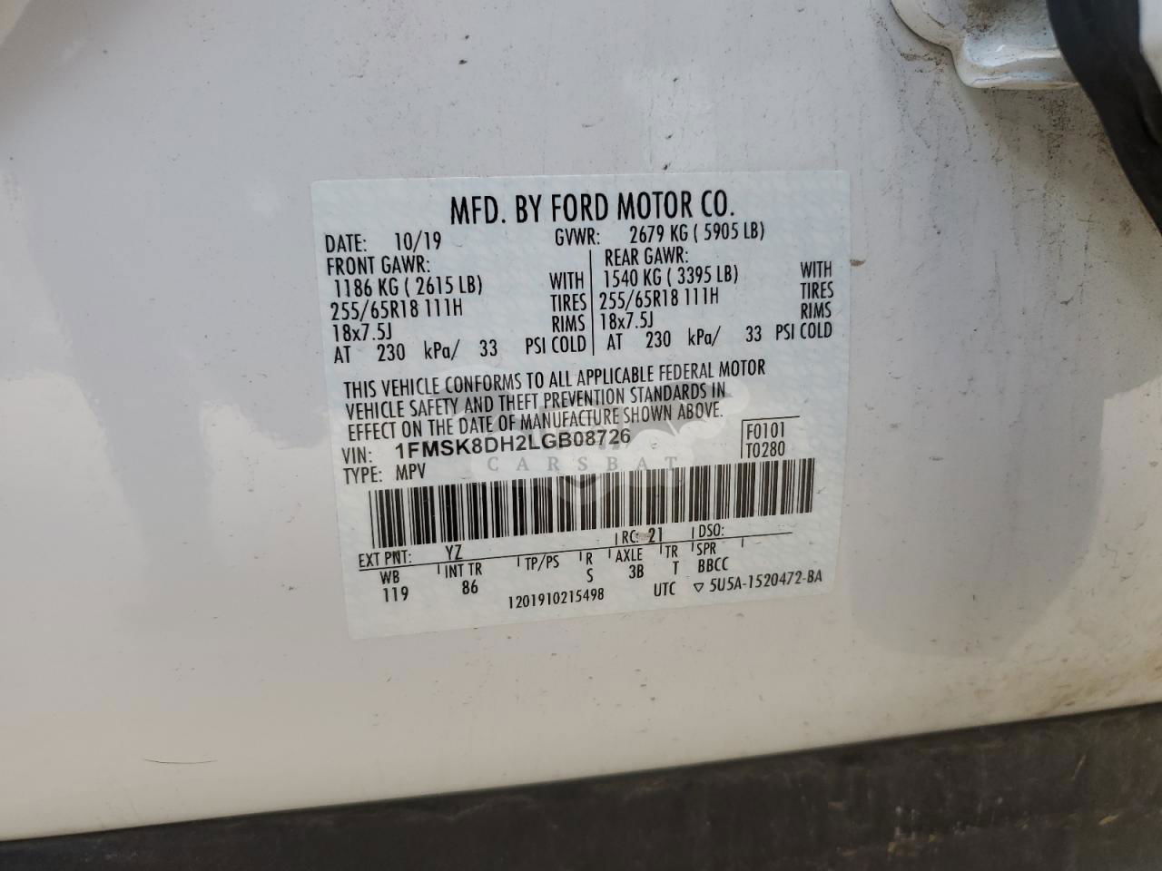 • VIN: 1FMSK8DH2LGB08726