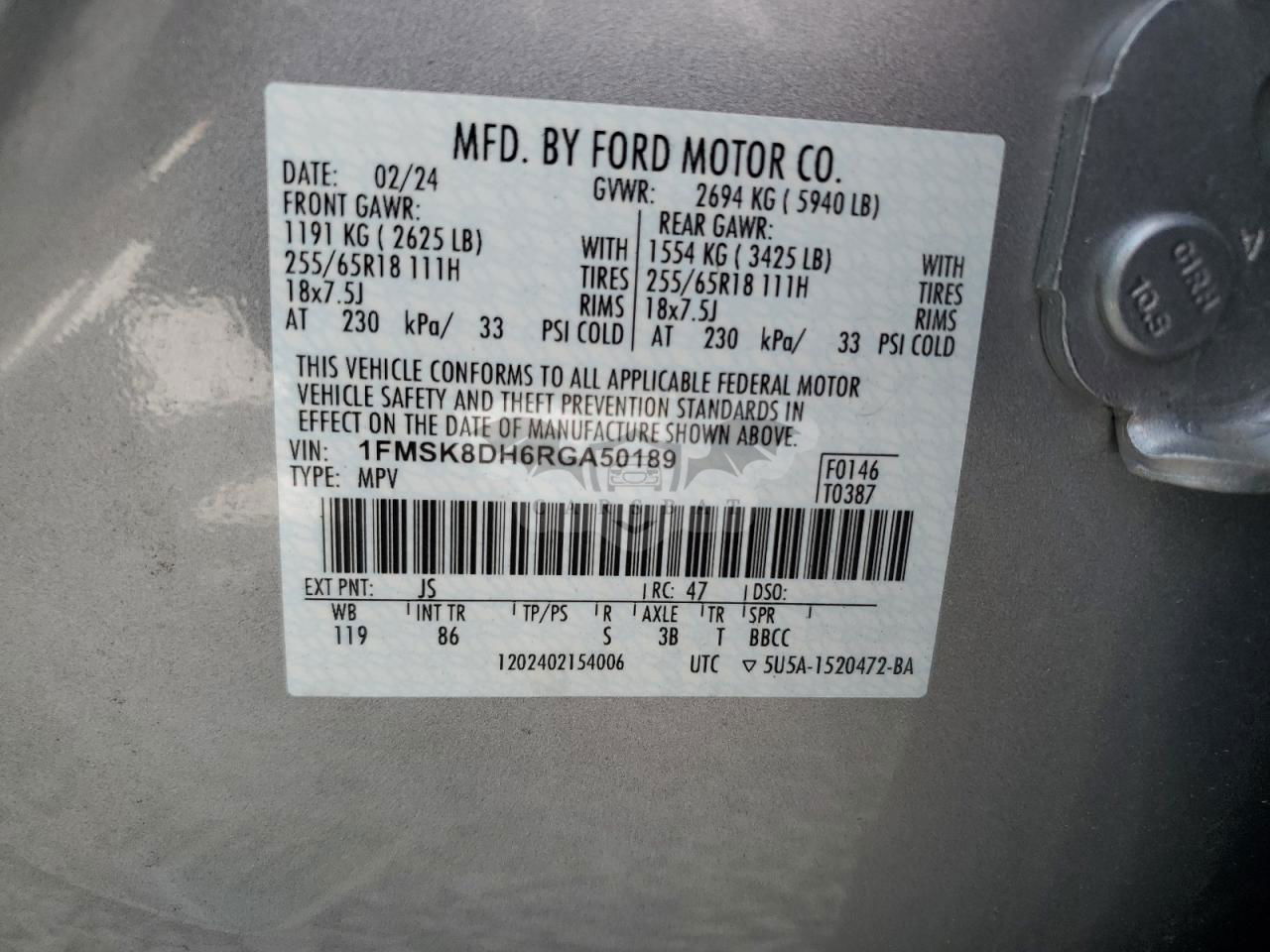 • VIN: 1FMSK8DH6RGA50189