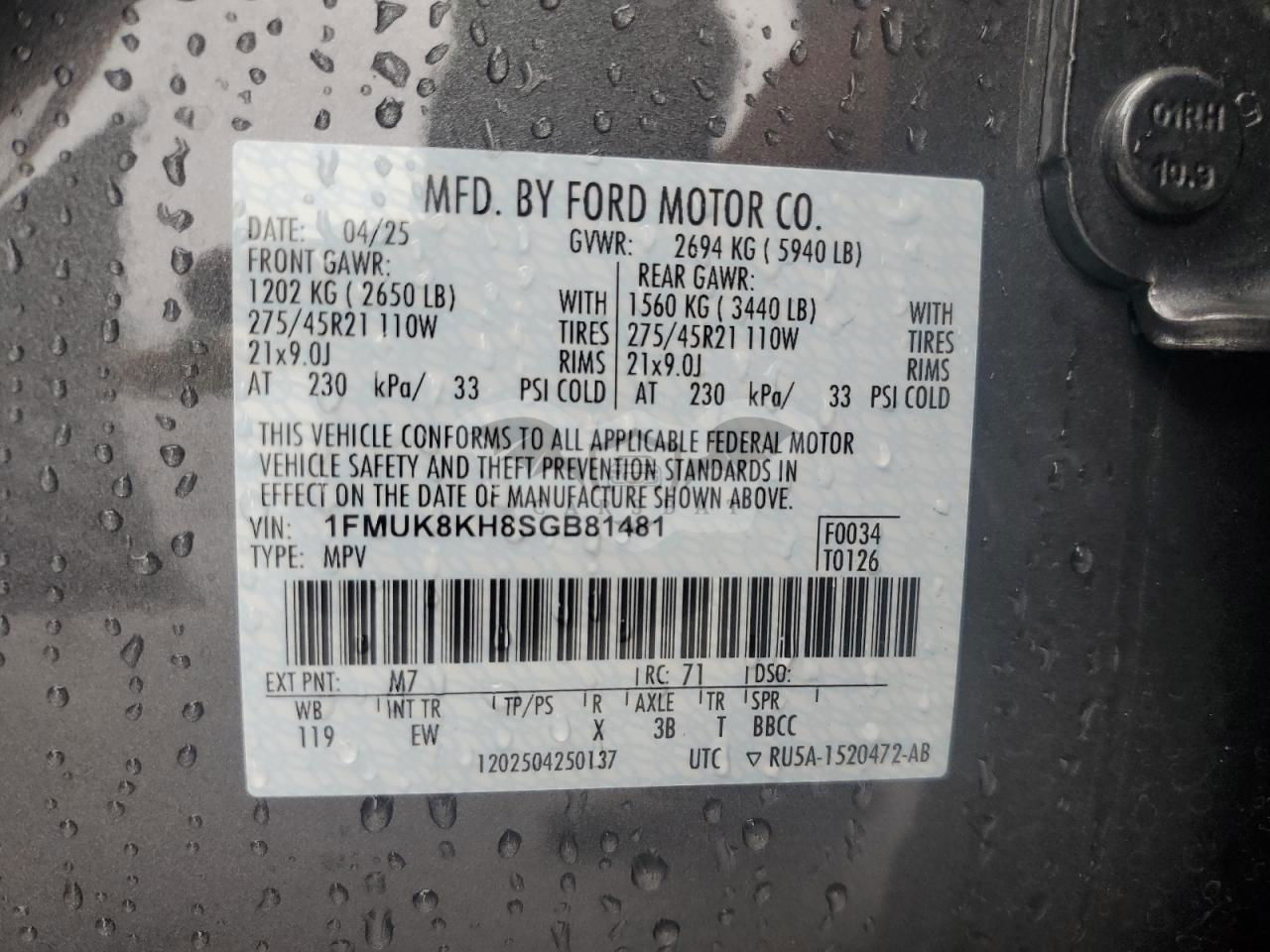 • VIN: 1FMUK8KH8SGB81481