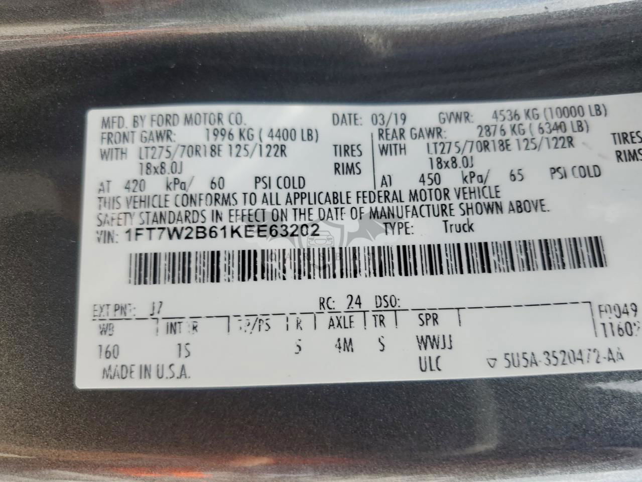 • VIN: 1FT7W2B61KEE63202