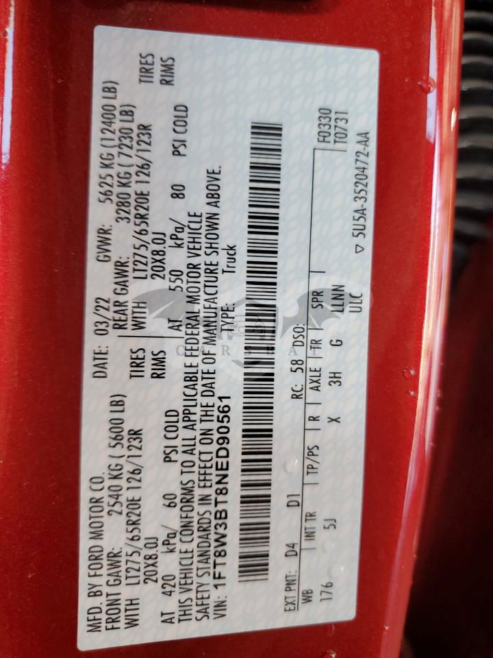 • VIN: 1FT8W3BT8NED90561