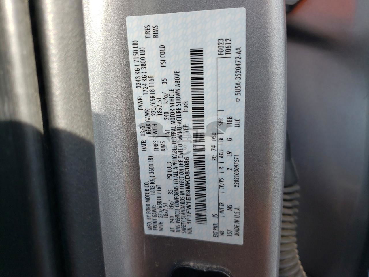 • VIN: 1FTFW1E89MKD83086