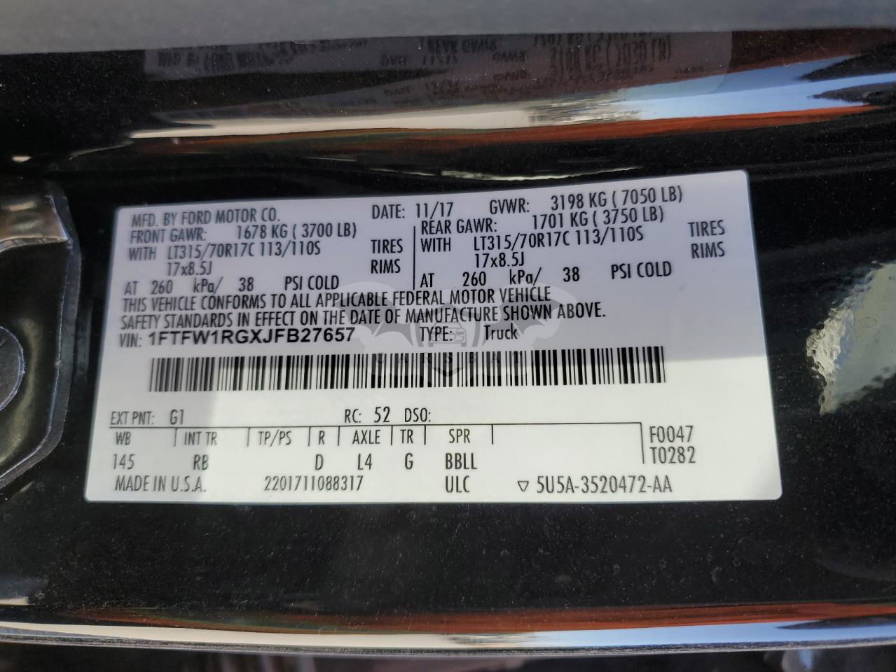 • VIN: 1FTFW1RGXJFB27657