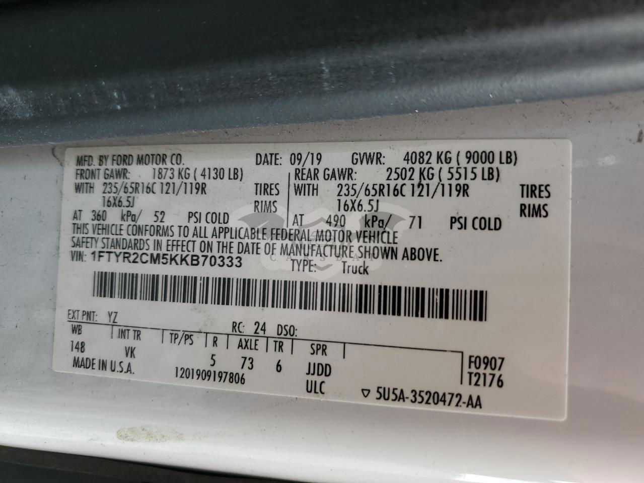 • VIN: 1FTYR2CM5KKB70333