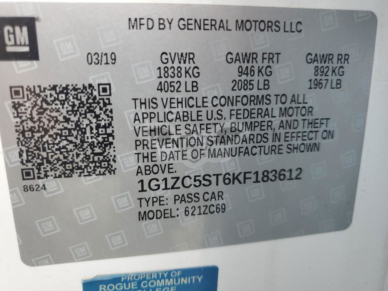 • VIN: 1G1ZC5ST6KF183612