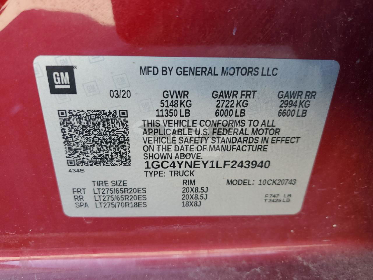 • VIN: 1GC4YNEY1LF243940