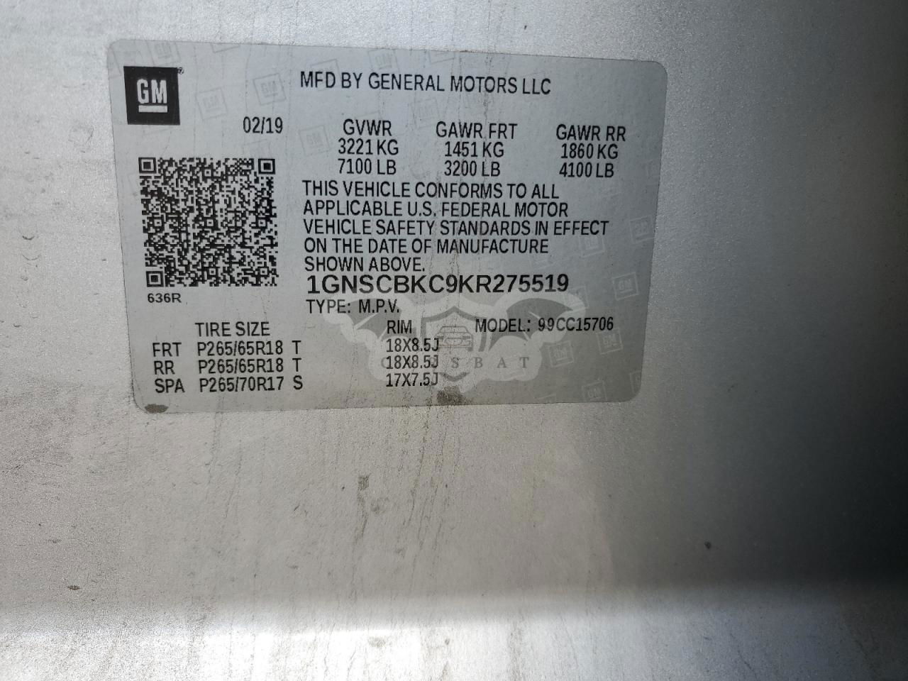 • VIN: 1GNSCBKC9KR275519