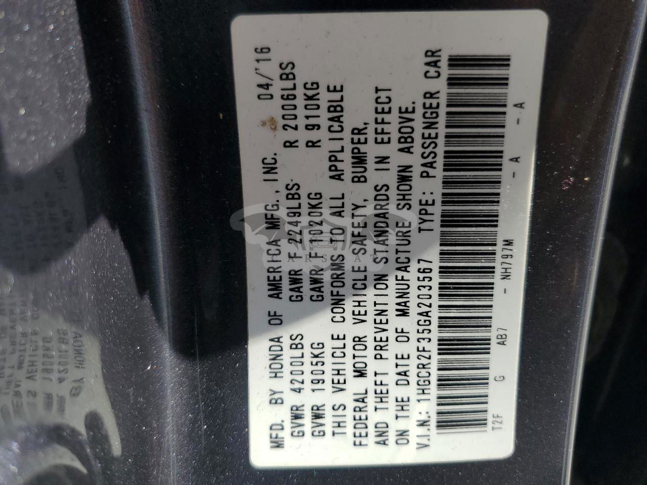 • VIN: 1HGCR2F35GA203567