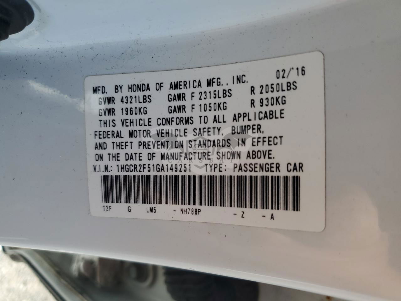 • VIN: 1HGCR2F51GA149251