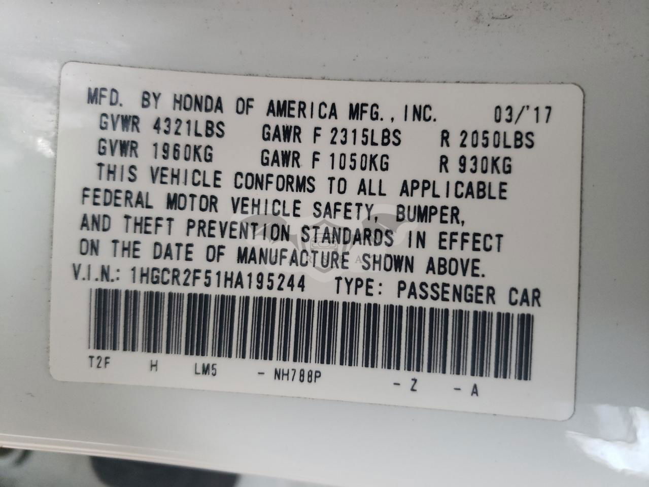 • VIN: 1HGCR2F51HA195244