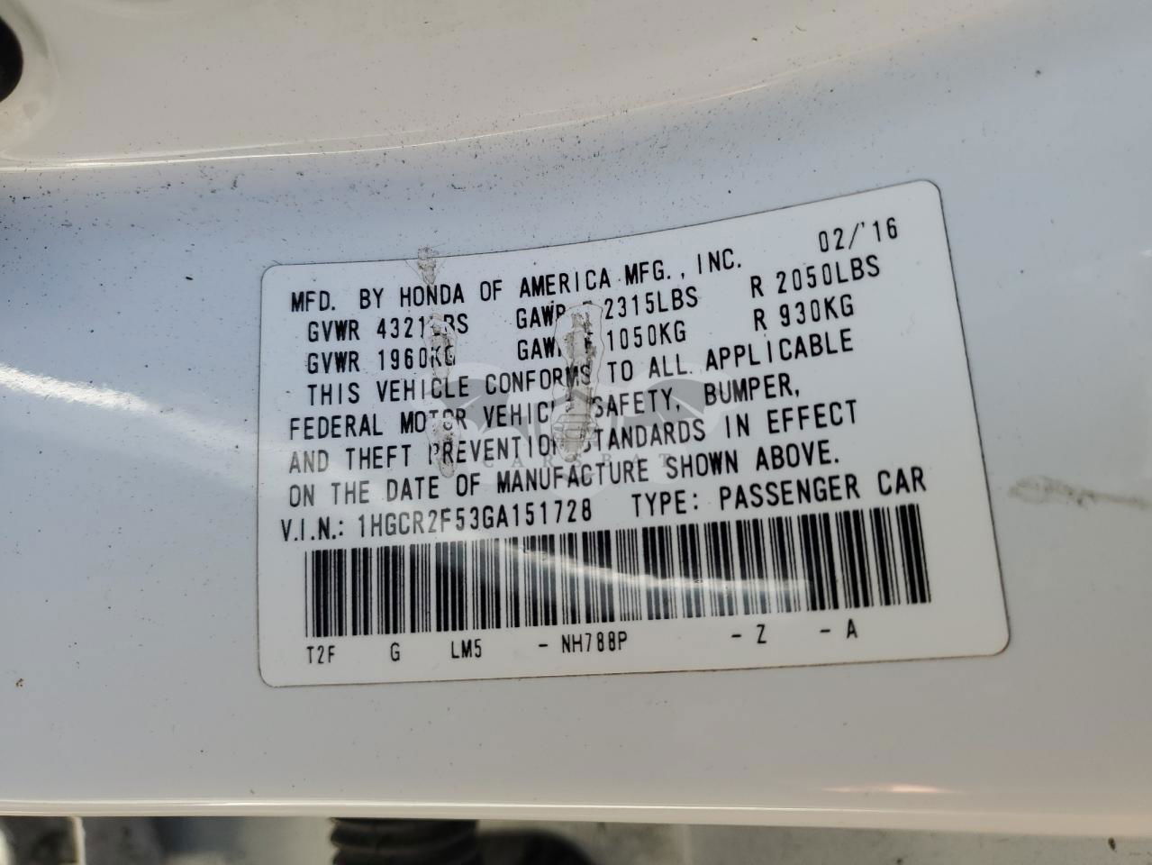 • VIN: 1HGCR2F53GA151728
