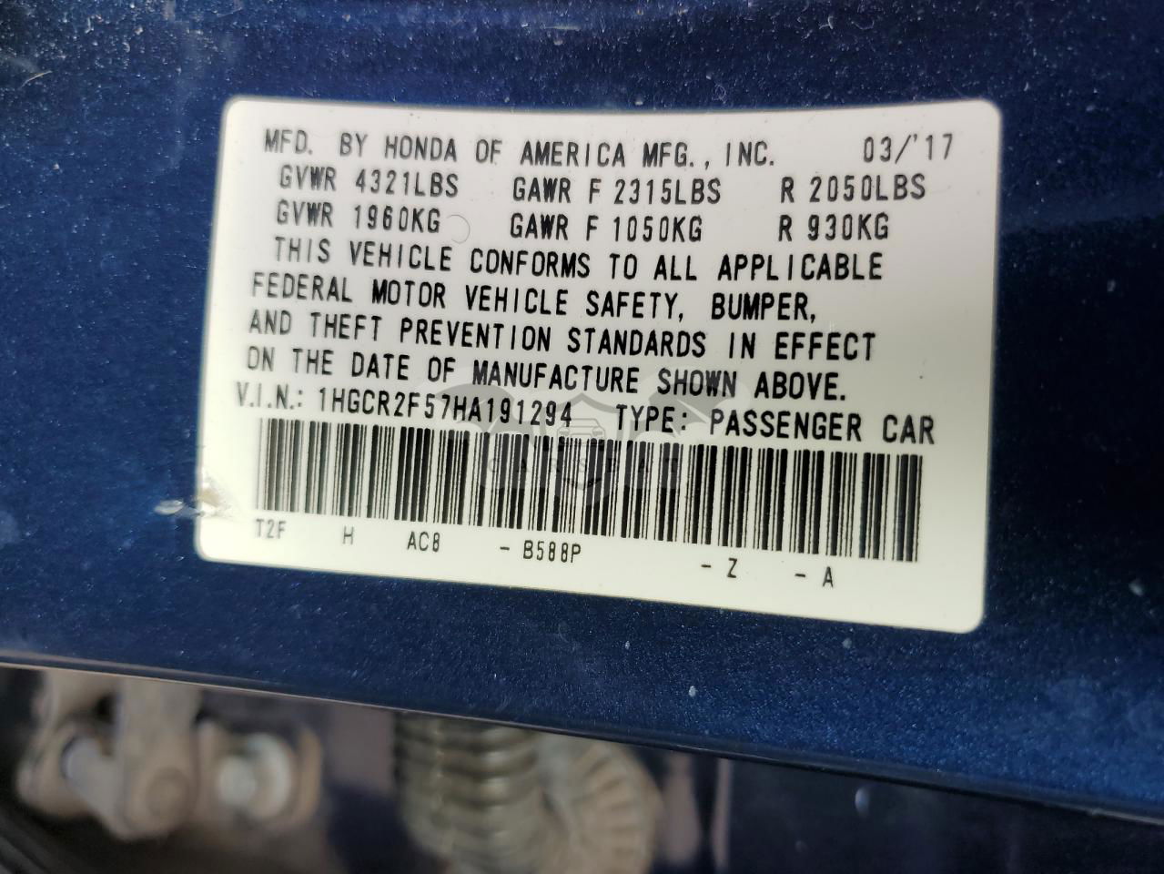 • VIN: 1HGCR2F57HA191294