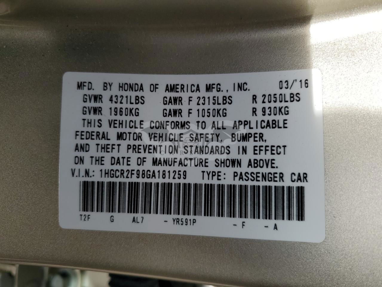 • VIN: 1HGCR2F98GA181259