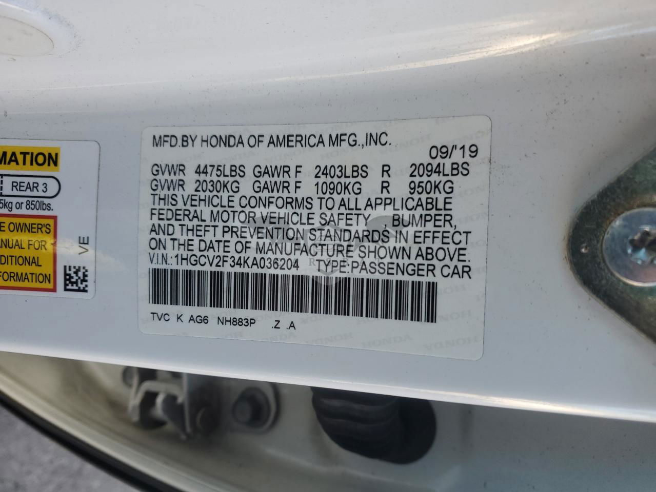 • VIN: 1HGCV2F34KA036204