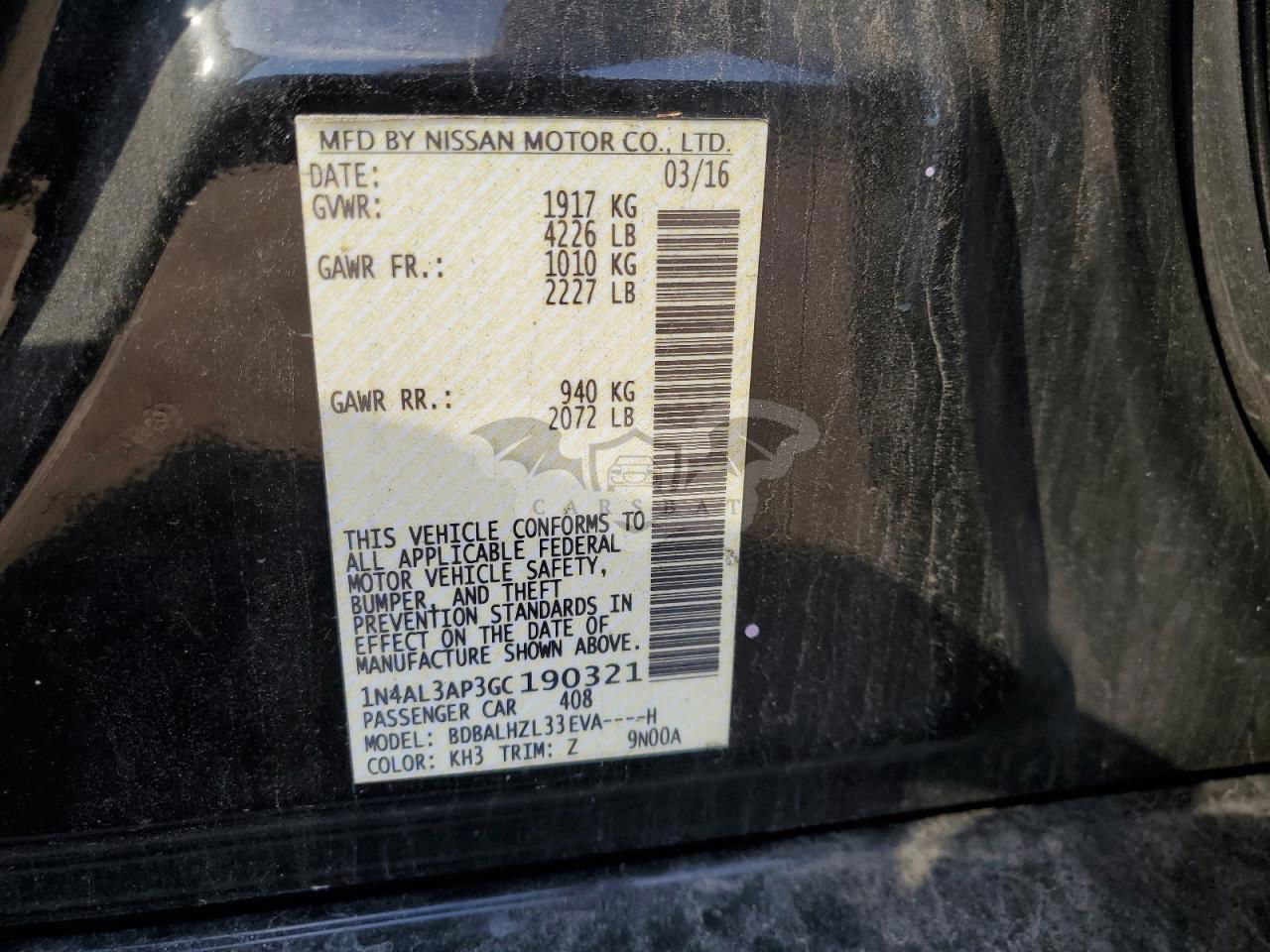 • VIN: 1N4AL3AP3GC190321