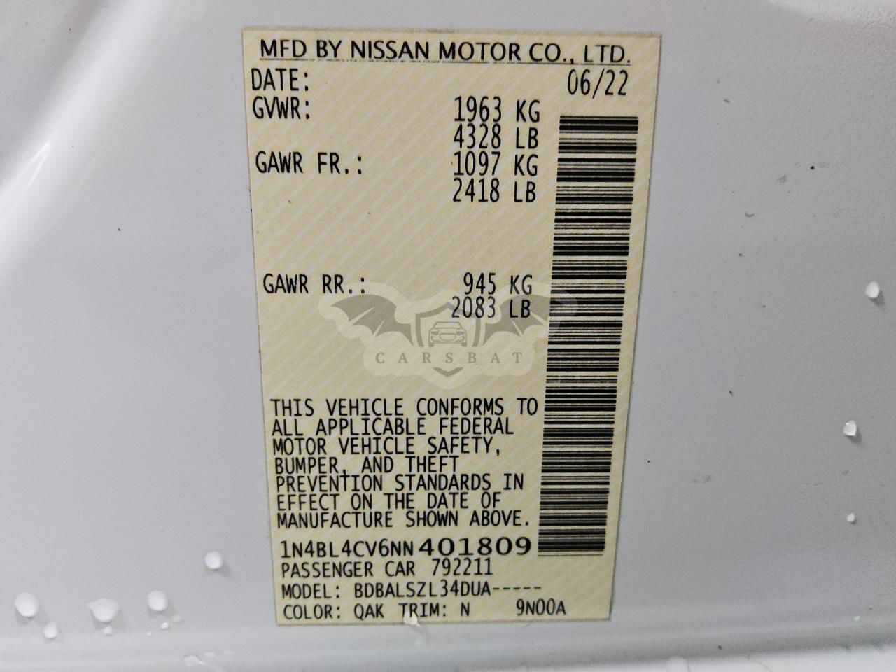 • VIN: 1N4BL4CV6NN401809