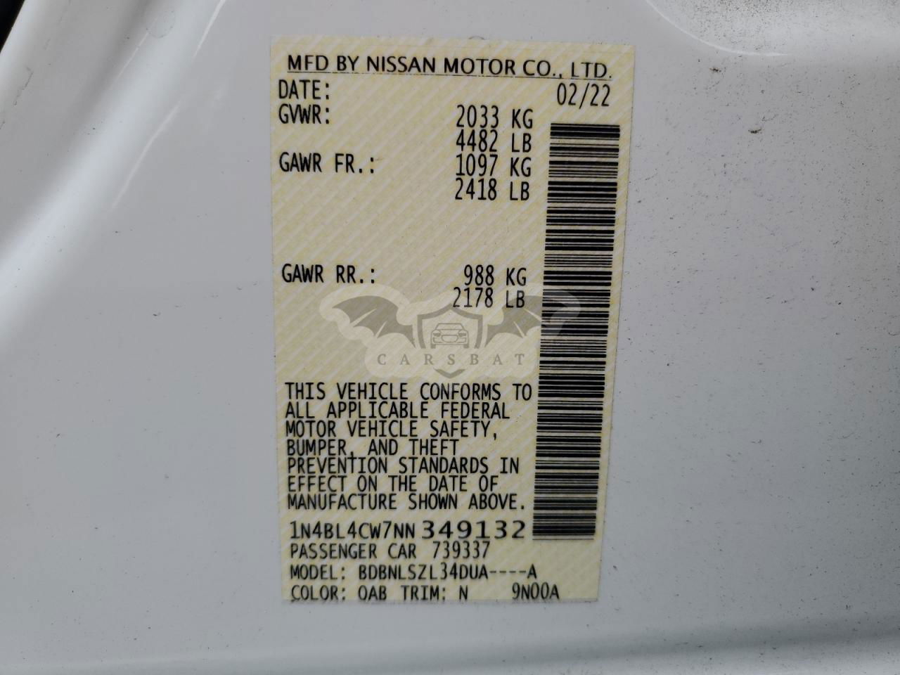 • VIN: 1N4BL4CW7NN349132