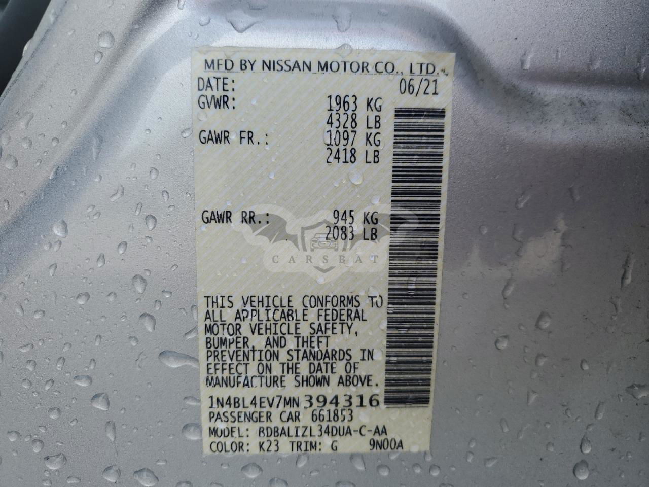 • VIN: 1N4BL4EV7MN394316