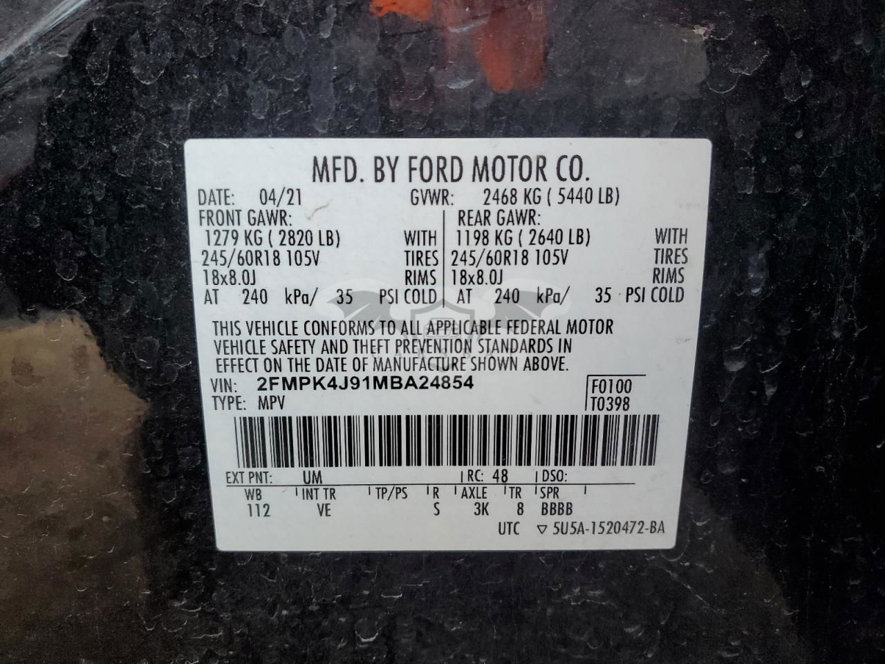 • VIN: 2FMPK4J91MBA24854