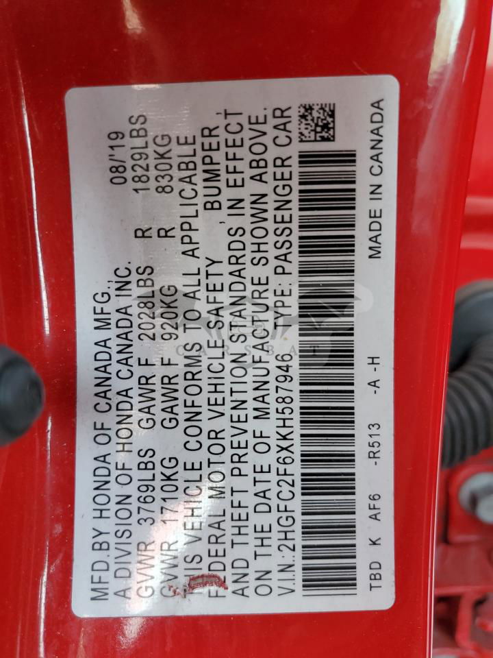 • VIN: 2HGFC2F6XKH587946