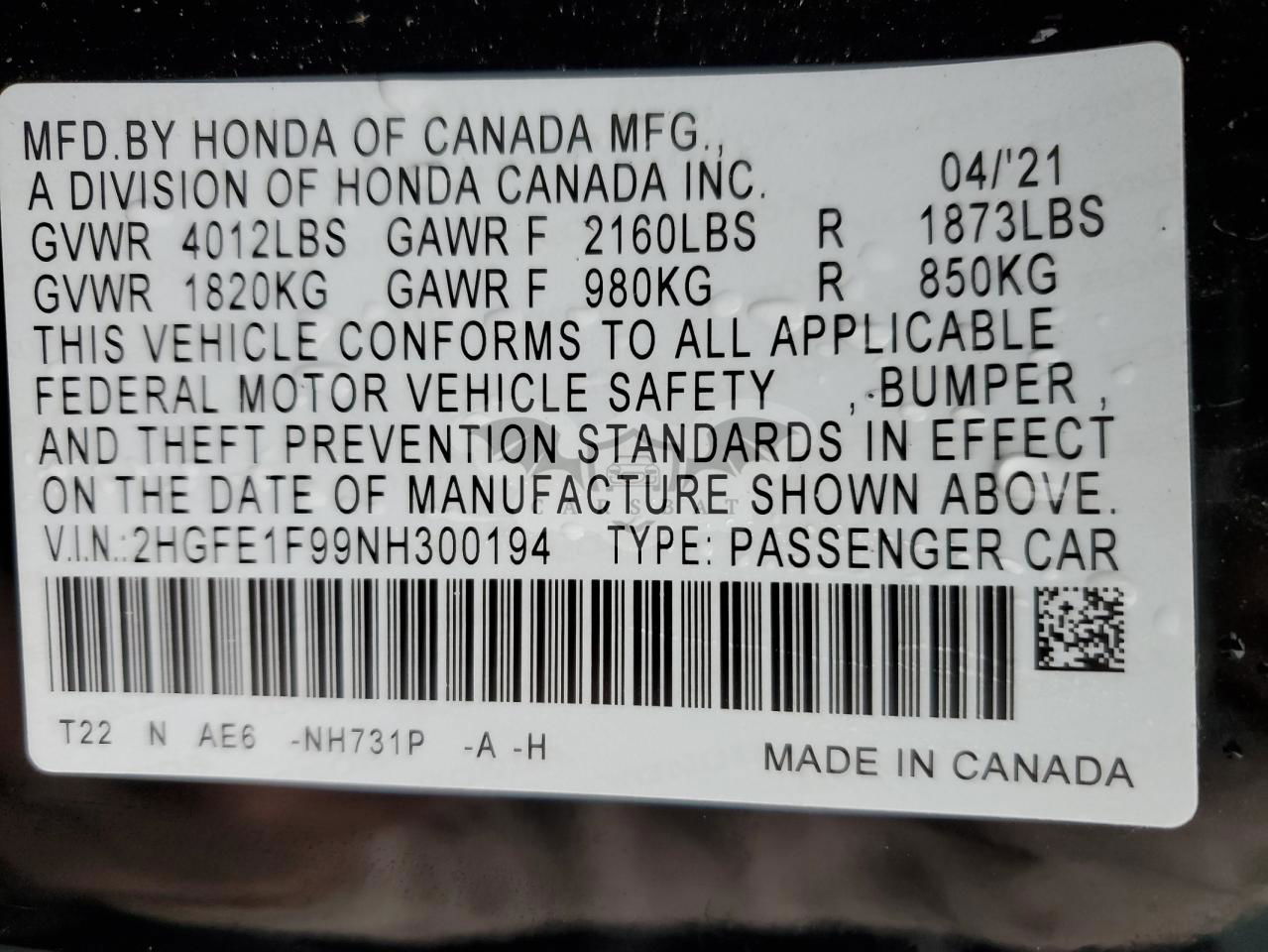 • VIN: 2HGFE1F99NH300194