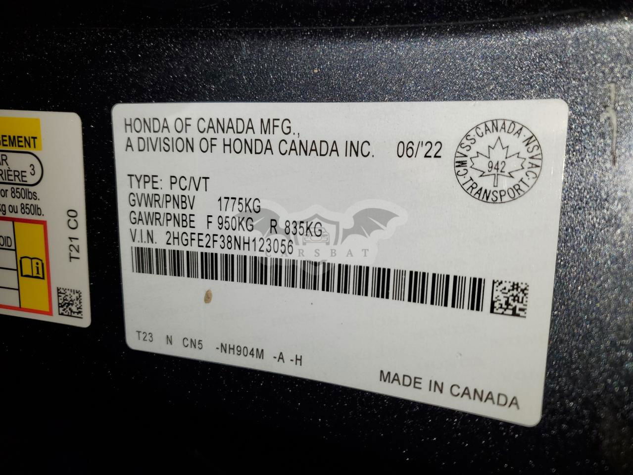 • VIN: 2HGFE2F38NH123056