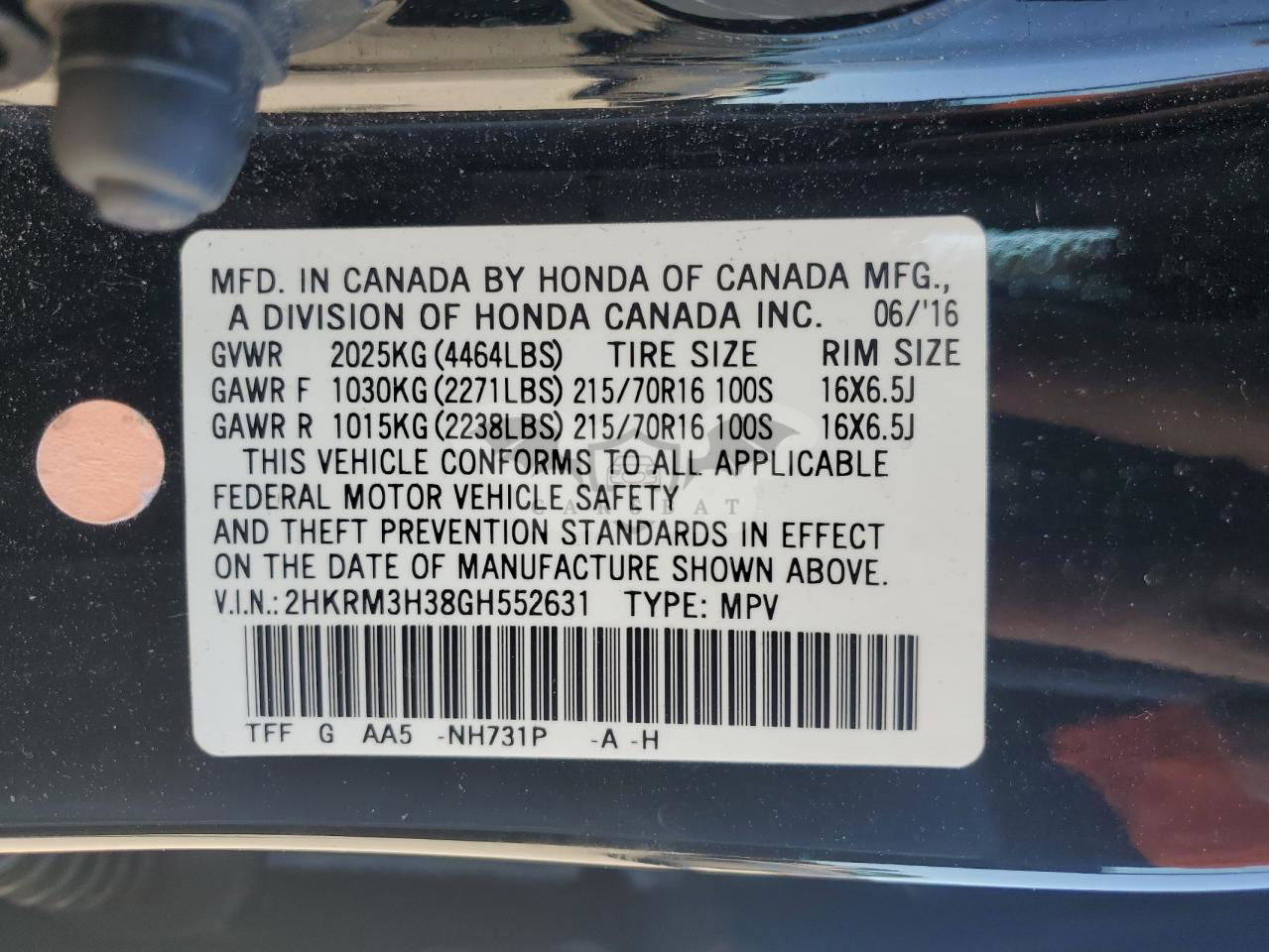 • VIN: 2HKRM3H38GH552631
