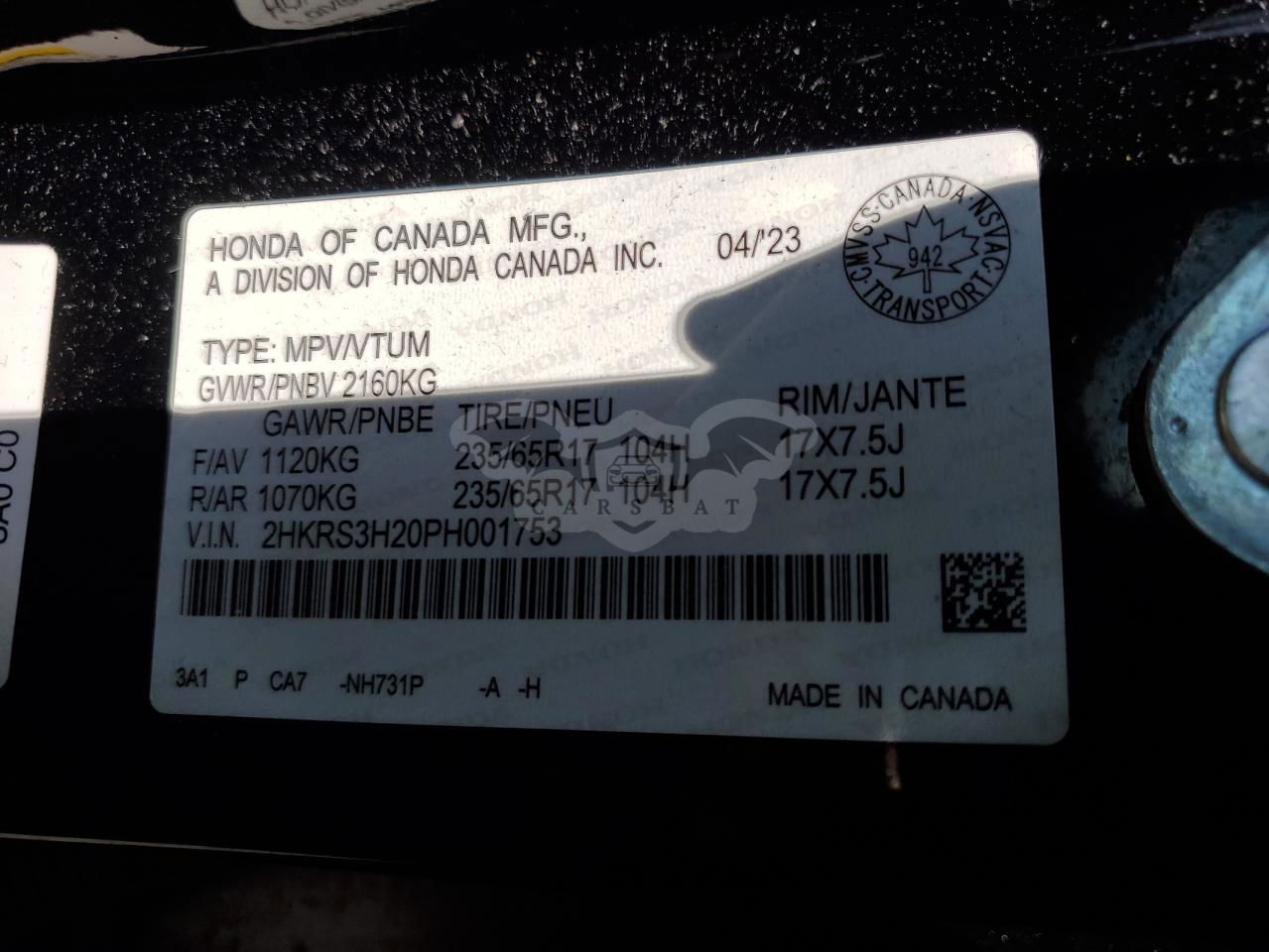 • VIN: 2HKRS3H20PH001753
