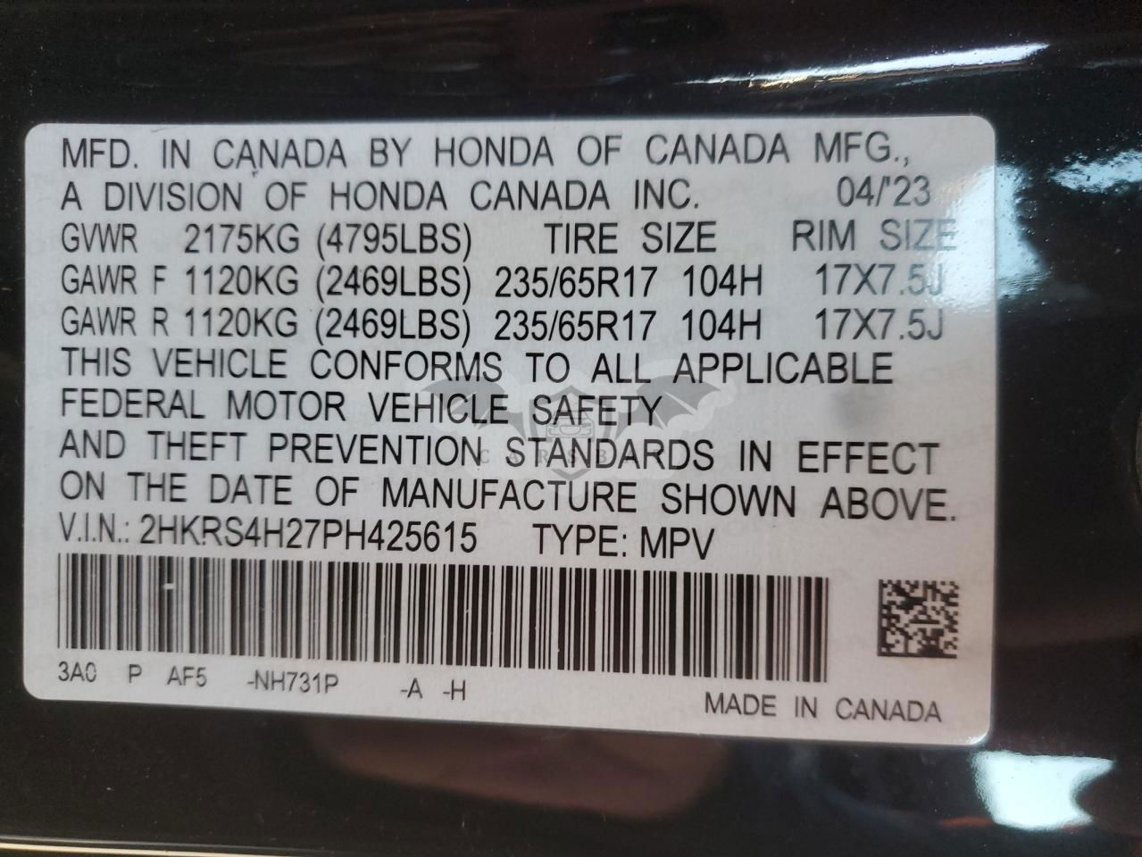 • VIN: 2HKRS4H27PH425615