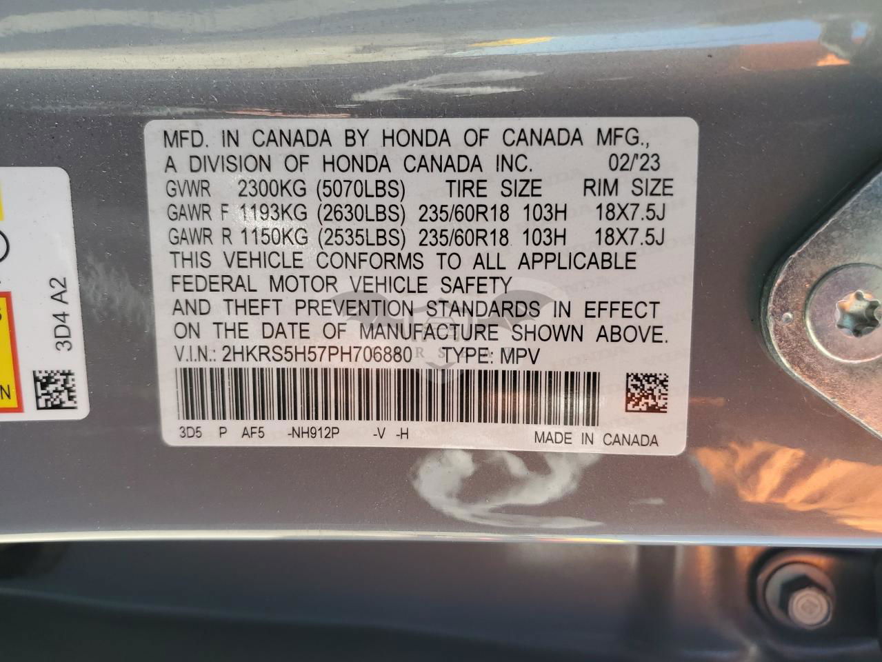 • VIN: 2HKRS5H57PH706880