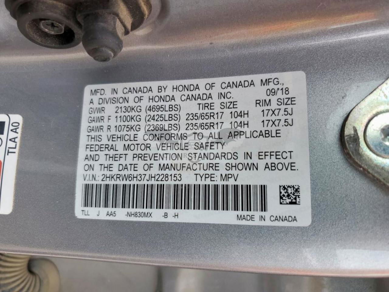 • VIN: 2HKRW6H37JH228153