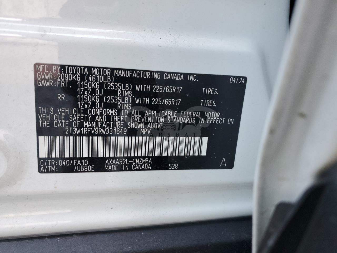 • VIN: 2T3W1RFV9RW331649