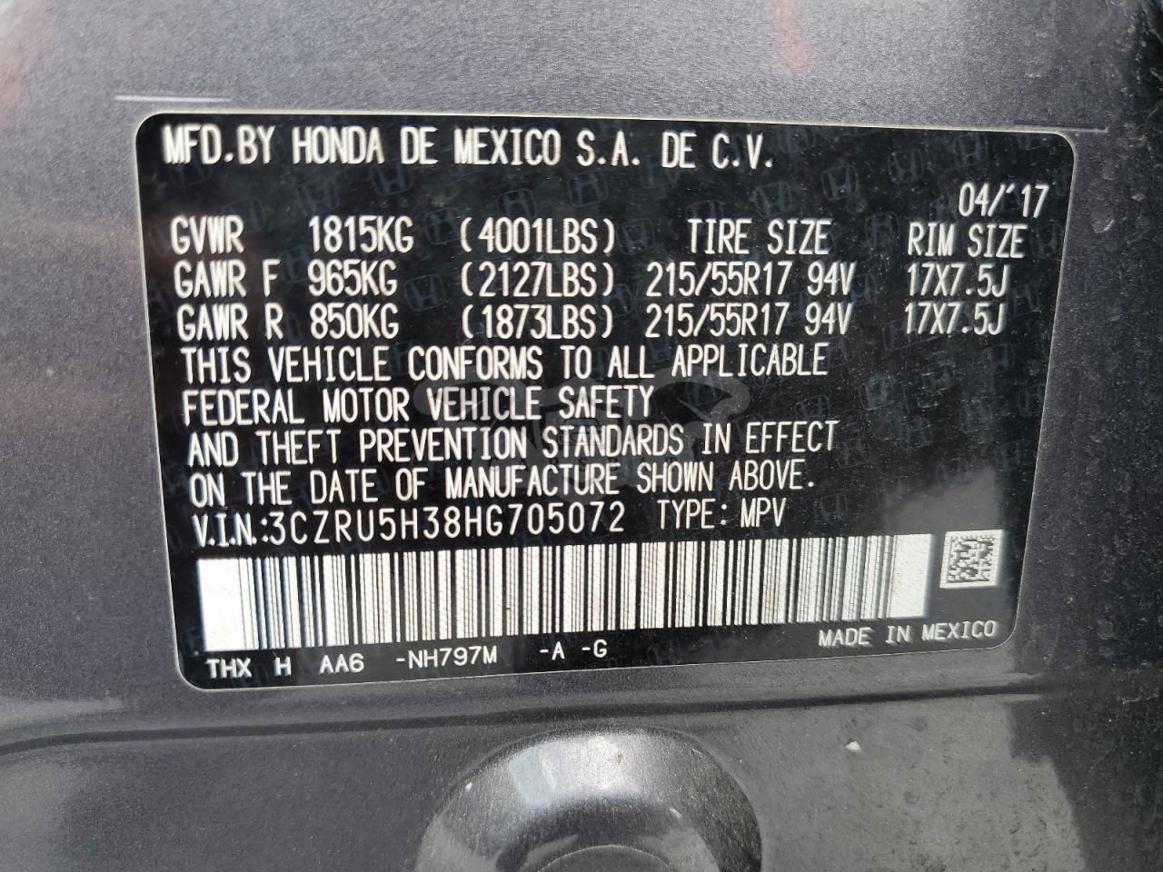 • VIN: 3CZRU5H38HG705072