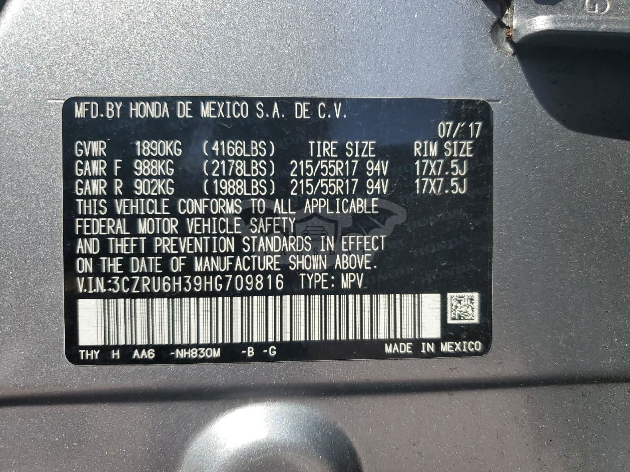 • VIN: 3CZRU6H39HG709816