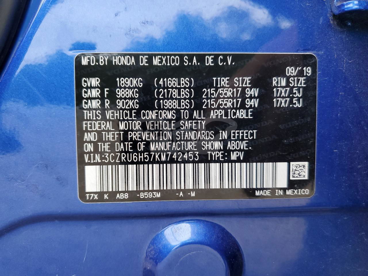 • VIN: 3CZRU6H57KM742453