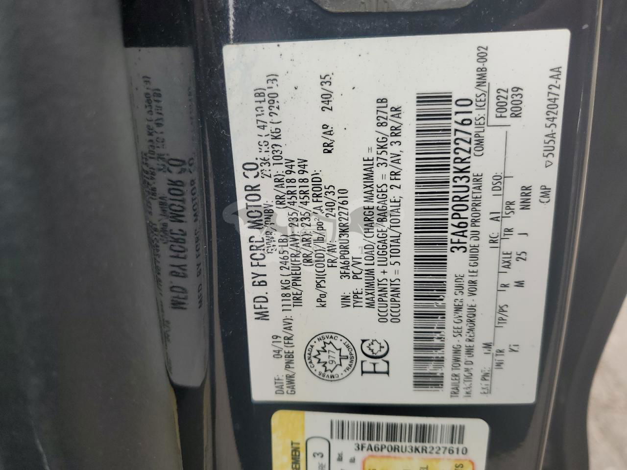 • VIN: 3FA6P0RU3KR227610