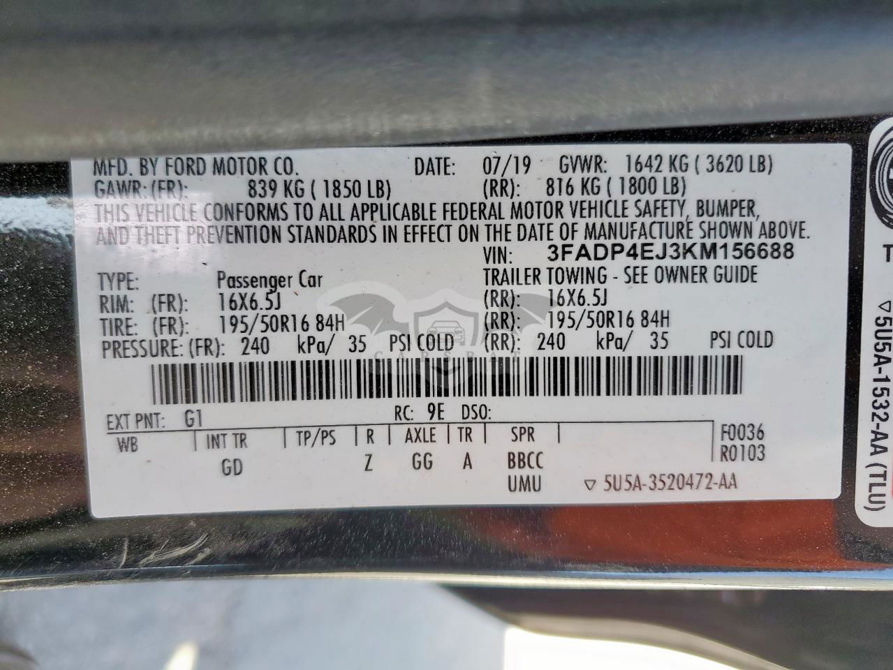 • VIN: 3FADP4EJ3KM156688