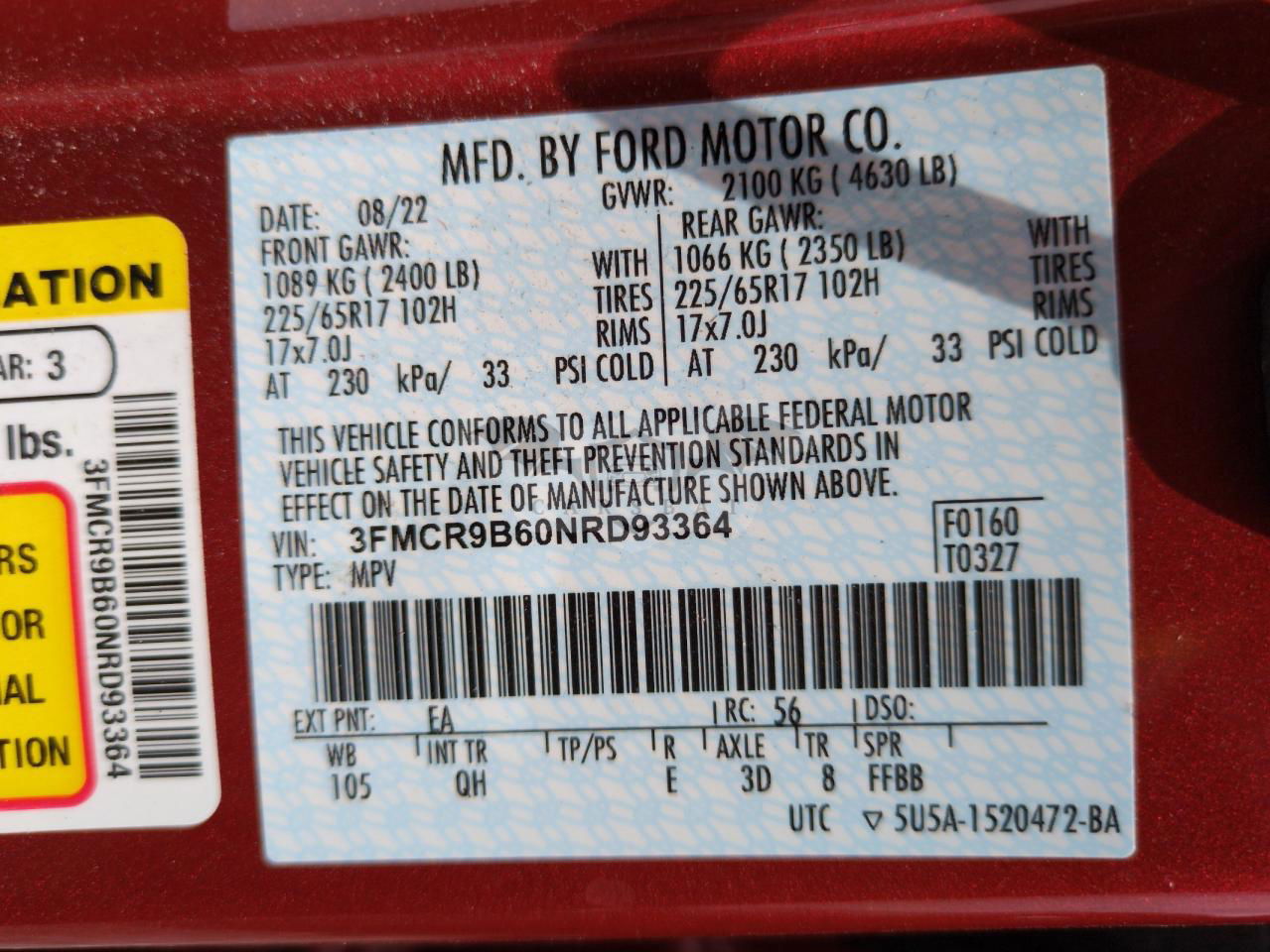 • VIN: 3FMCR9B60NRD93364